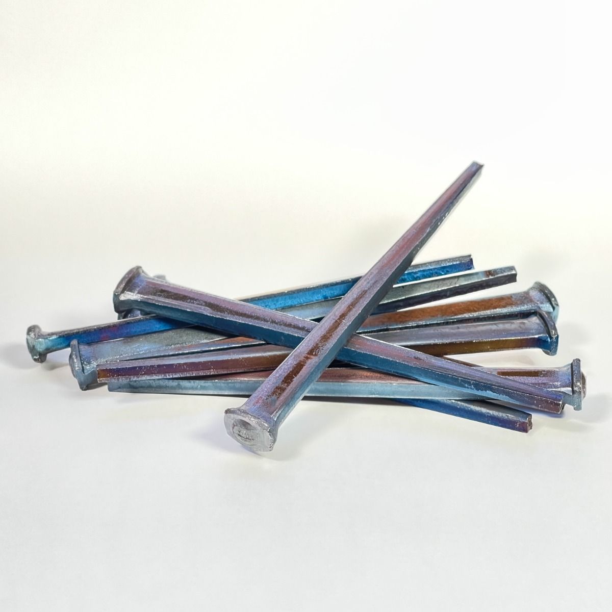 All our nails are made from flat sheets of steel. Our Masonry, Flooring and Common nails are made with a high-carbon steel. All others are made with low-carbon steel. Some nails are galvanized after cutting. For a more authentic look, the Decorative Wrought Head nail is given a black oxide finish.